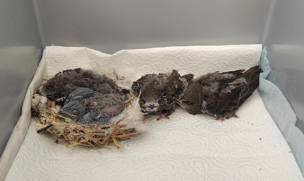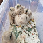 Zwei unterernährte junge Turmfalken hat die Wildvogelhilfe des NABU Leipzig in der Innenstadt geborgen. In dem Alter sollten die Tiere wenigstens 170 Gramm wiegen, besser mehr. Die Leichtgewichte brachten nur 130 und 135 Gramm auf die Waage, waren deshalb auch unterkühlt. Kleine Häppchen Fleisch alle 2 Stunden und ein Wärmekissen zeigten Wirkung, sodass es den beiden bald deutlich besser ging.