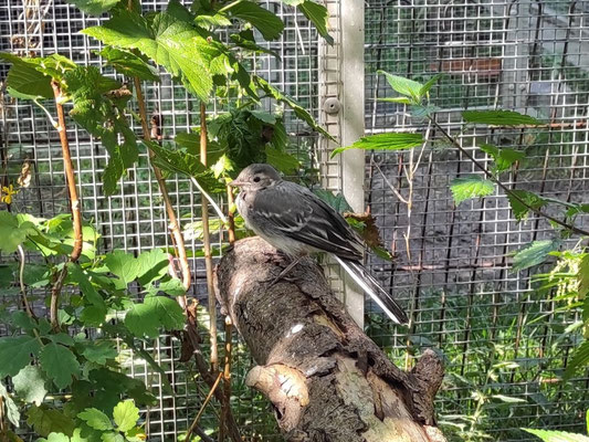 Diese Bachstelze wurde nestjung in die Wildvogelhilfe des NABU Leipzig gebracht, nachdem sie auf einem Anhänger mit Holz gefunden wurde. Das Nest wurde leider erst entdeckt, nachdem das Holz schon weit entfernt von der Vogelmutter an einen anderen Ort geliefert wurde. Drei Jungvögel waren bereits verhungert. Diese junge Bachstelze hat überlebt und wurde in der Wildvogelhilfe im Stundentakt mit Insekten versorgt. Nun frisst sie selbstständig und fliegt vital durch die Voliere. Der Auswilderung steht nichts im Weg.