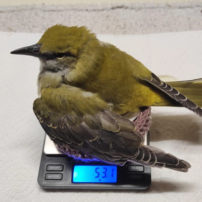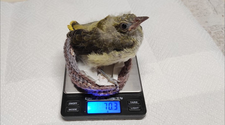 Ein nestjunger Pirol wurde am Boden gefunden und zur Wildvogelhilfe Leipzig gebracht. Am Fundtag hatte er ein Gewicht von 39 Gramm. Nach nur einer Woche stündlicher und abwechslungsreicher Fütterung mit Insekten und Früchten hat er schon ein Gewicht von 70 Gramm.