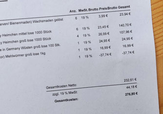 Ein Star frisst täglich etwa 130 Heimchen, einige Mehlwürmer, Wachsmaden und Früchte. Die Futterkosten betragen pro Tag 3,50 Euro je Star. Bei durchschnittlich 20 Pflegetagen macht das 70 Euro je Star. 2022 wurden bis jetzt 15 Stare im Nestlingsalter betreut. Das sind also Kosten von ca. 1.050 Euro.
