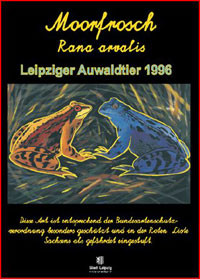 Das Auwaldtier des Jahres 1996 ist ein kleiner zierlicher Braunfrosch mit spitzer Schnauze. Von seinem glatten Rücken hebt sich die weiße Drüsenleiste deutlich ab. Zur Paarungszeit zwischen März und April sind die Männchen oft leuchtend blau oder violett. Heimisch ist der Moorfrosch im nordöstlichen Mitteleuropa sowie in Nord- und Osteuropa bis Sibirien. Seine bevorzugten Lebens- räume sind dabei Niedermoore, Riedgebiete, Feuchtwiesen, Auwälder und generell Gebiete mit hohem Grundwasserstand. Zur Laichzeit sind die Frösche auf überschwemmten Flächen, an Teichen und Wassergräben mit reich strukturierten, besonnten Uferbereichen zu finden. Die Männchen rufen dann mit leiser Stimme, wobei der Ruf an das Geräusch von Luftblasen, die aus einer unter-getauchten Flasche entweichen, erinnert. Früher war der Moorfrosch der am häufigsten anzutreffende Auwaldlurch, doch seit 1980 wurde ein laufender Rückgang verzeichnet, seit 1985 ein drastischer Rückgang.